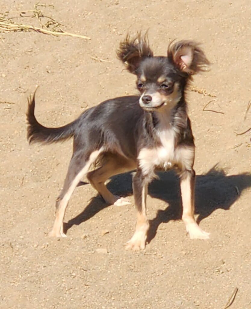 This pup is a Chihuahua, 1 teacup female available, 7 months old, charting to mature at 5lbs.
